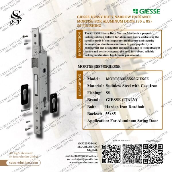 In summary, the GIESSE Heavy Duty Narrow Mortise represents a perfect blend of security, durability, and aesthetic harmony in the realm of aluminum door hardware. Its thoughtful design not only provides robust protection against unauthorized entry but also complements the modern design of aluminum doors. For those seeking a reliable, stylish, and efficient locking solution, the GIESSE mortise lock stands out as an exemplary choice, reaffirming its reputation as a leader in door hardware innovation.