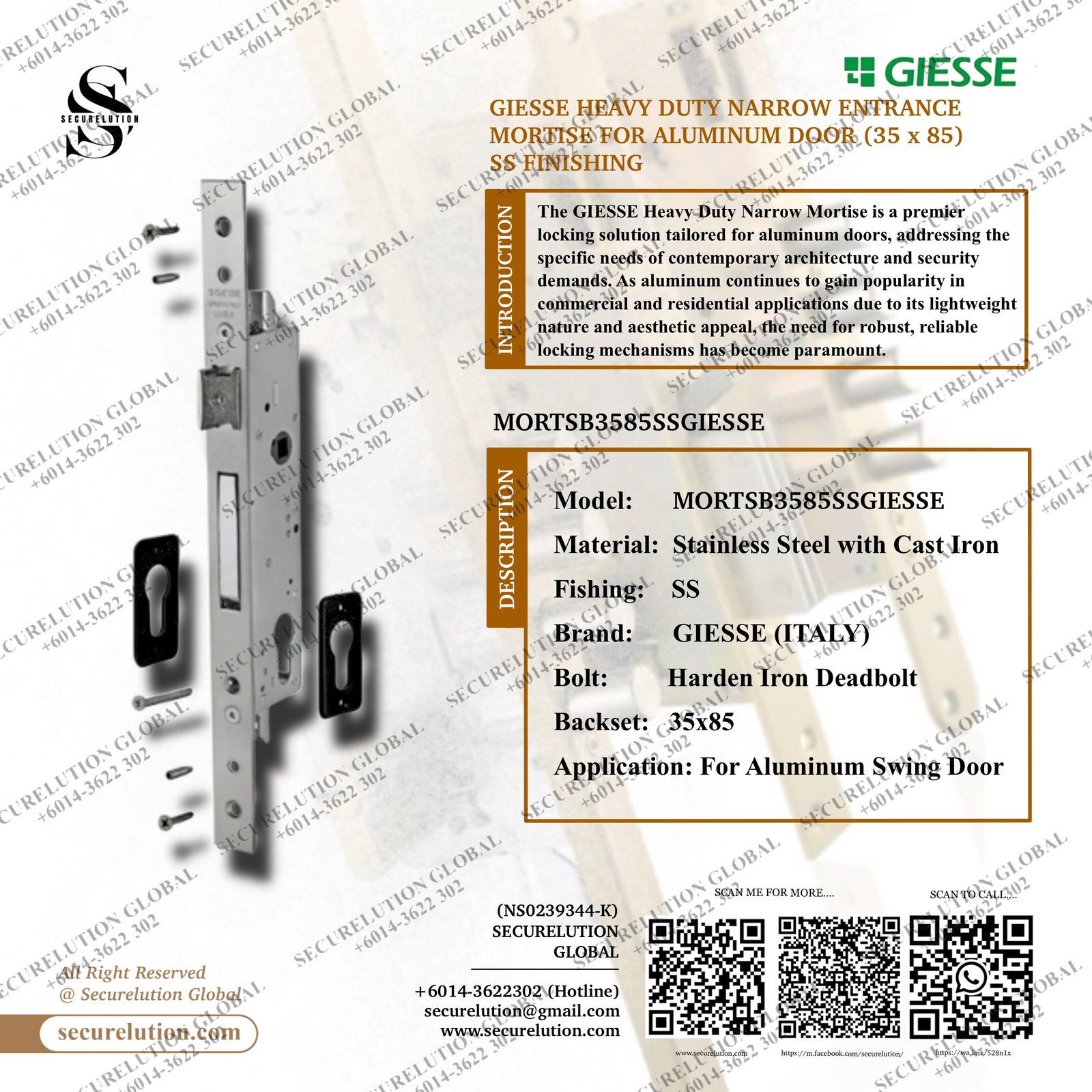 GIESSE HEAVY DUTY NARROW ENTRANCE MORTISE LOCK FOR ALUMINUM DOOR (35 x 85) SS FINISHING