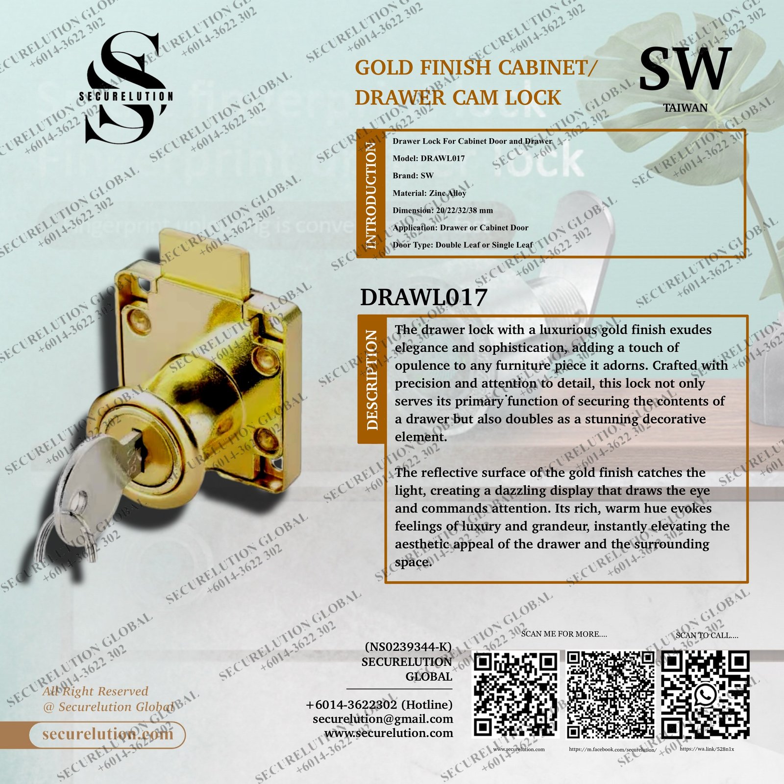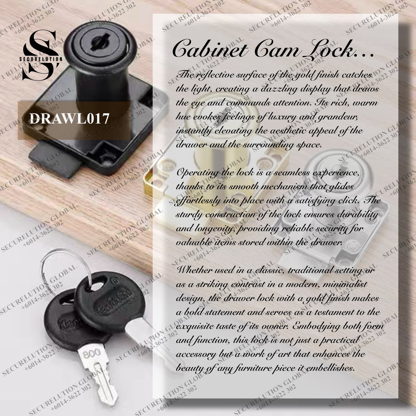 The drawer lock with a luxurious gold finish exudes elegance and sophistication, adding a touch of opulence to any furniture piece it adorns. Crafted with precision and attention to detail, this lock not only serves its primary function of securing the contents of a drawer but also doubles as a stunning decorative element.