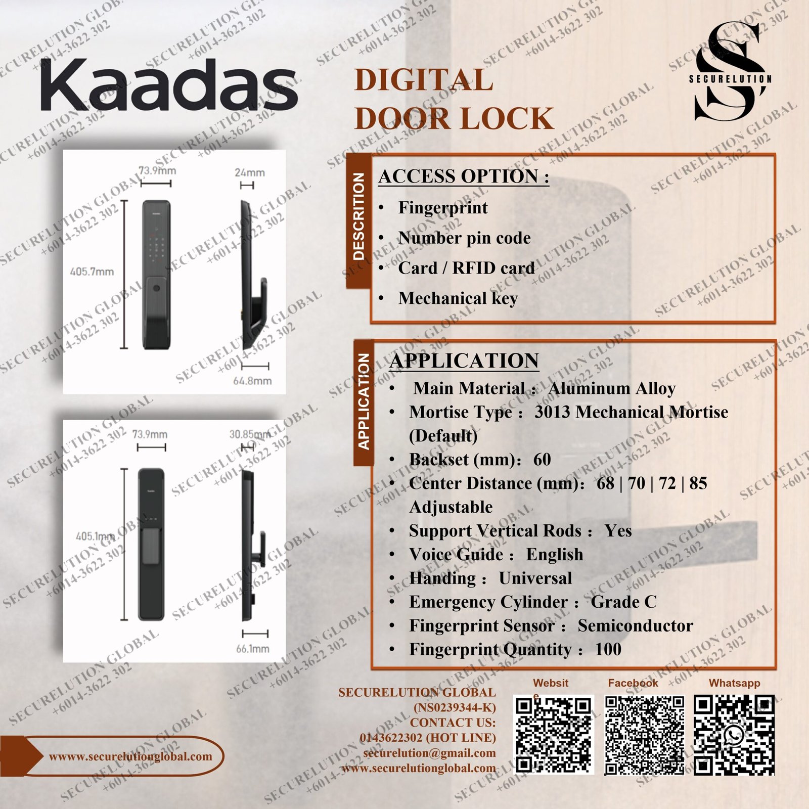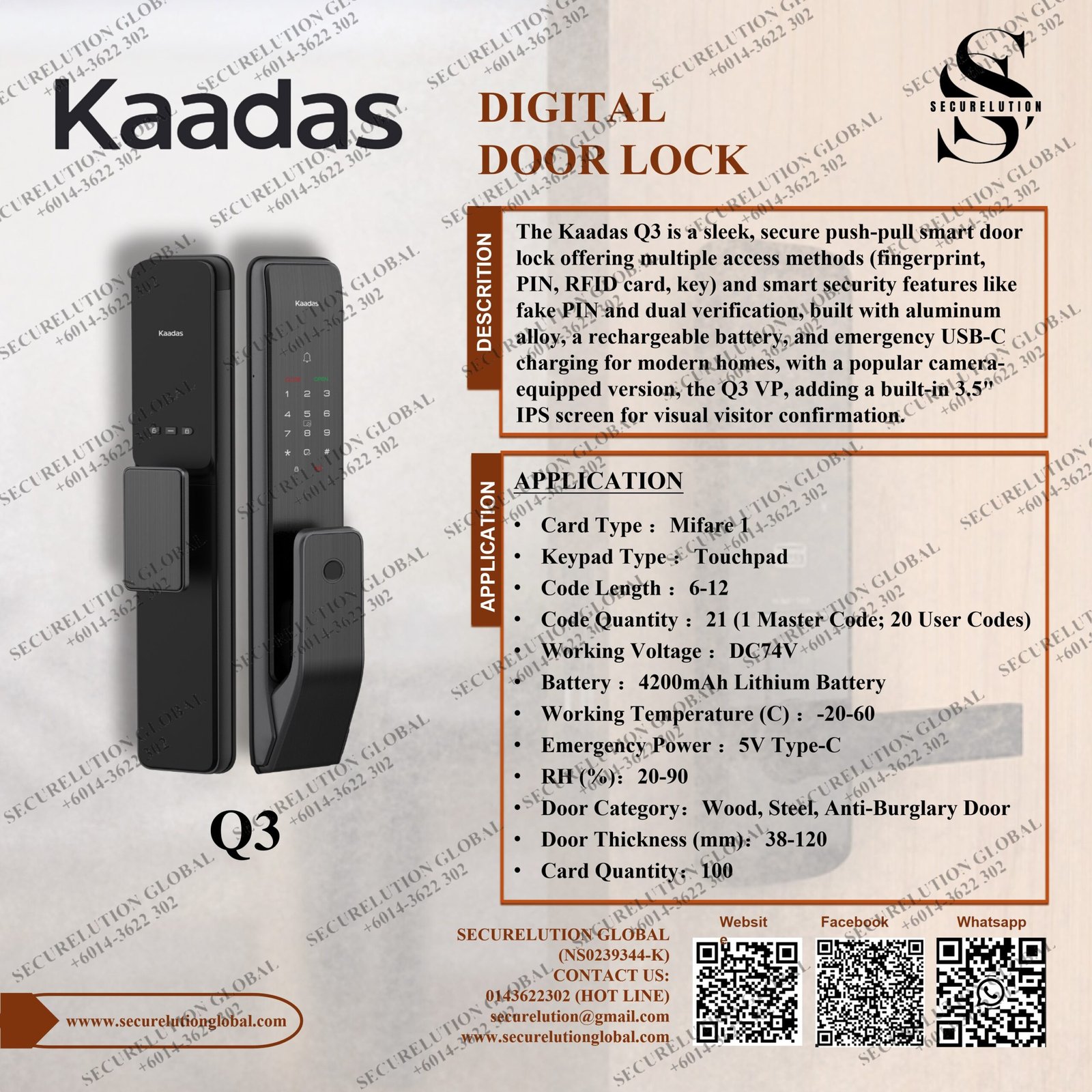 The Kaadas Q3 is a sleek, secure push-pull smart door lock offering multiple access methods (fingerprint, PIN, RFID card, key) and smart security features like fake PIN and dual verification, built with aluminum alloy, a rechargeable battery, and emergency USB-C charging for modern homes, with a popular camera-equipped version, the Q3 VP, adding a built-in 3.5″ IPS screen for visual visitor confirmation.