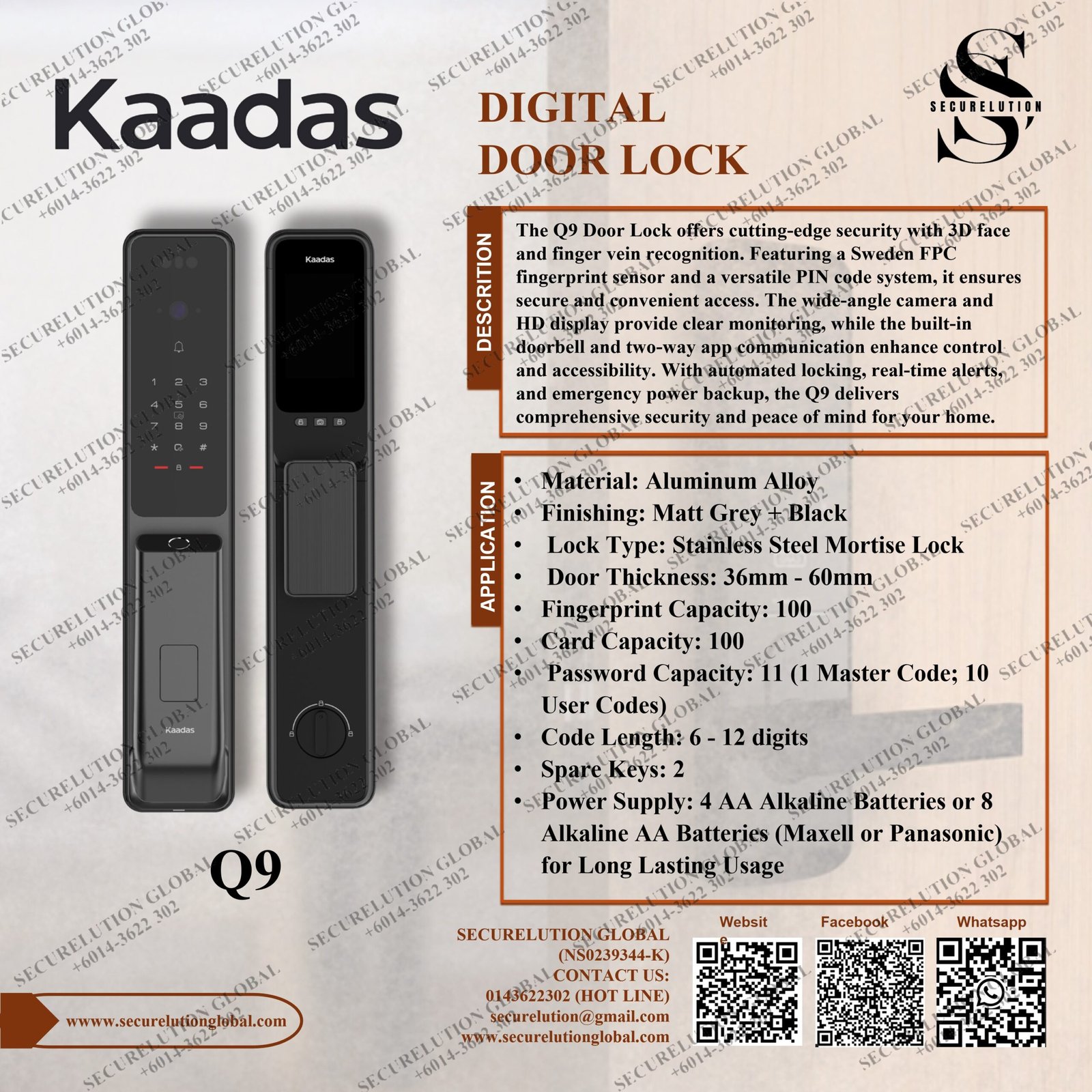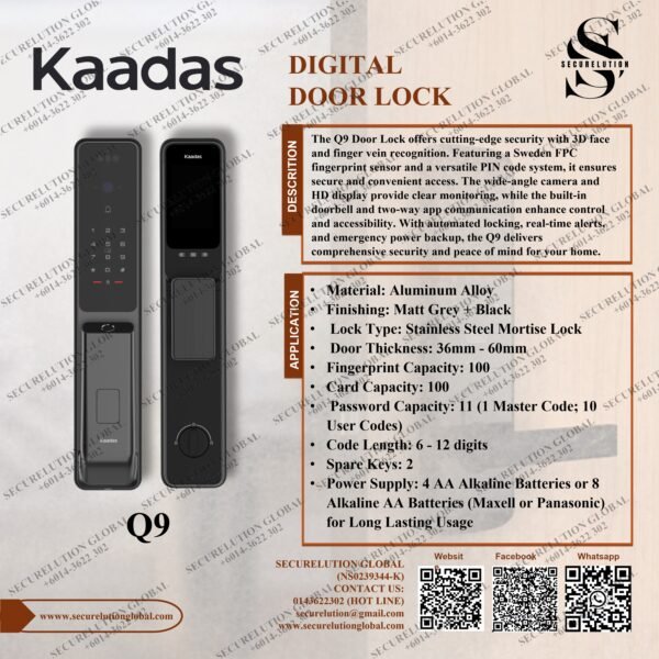 The Q9 Door Lock offers cutting-edge security with 3D face and finger vein recognition. Featuring a Sweden FPC fingerprint sensor and a versatile PIN code system, it ensures secure and convenient access. The wide-angle camera and HD display provide clear monitoring, while the built-in doorbell and two-way app communication enhance control and accessibility. With automated locking, real-time alerts, and emergency power backup, the Q9 delivers comprehensive security and peace of mind for your home.