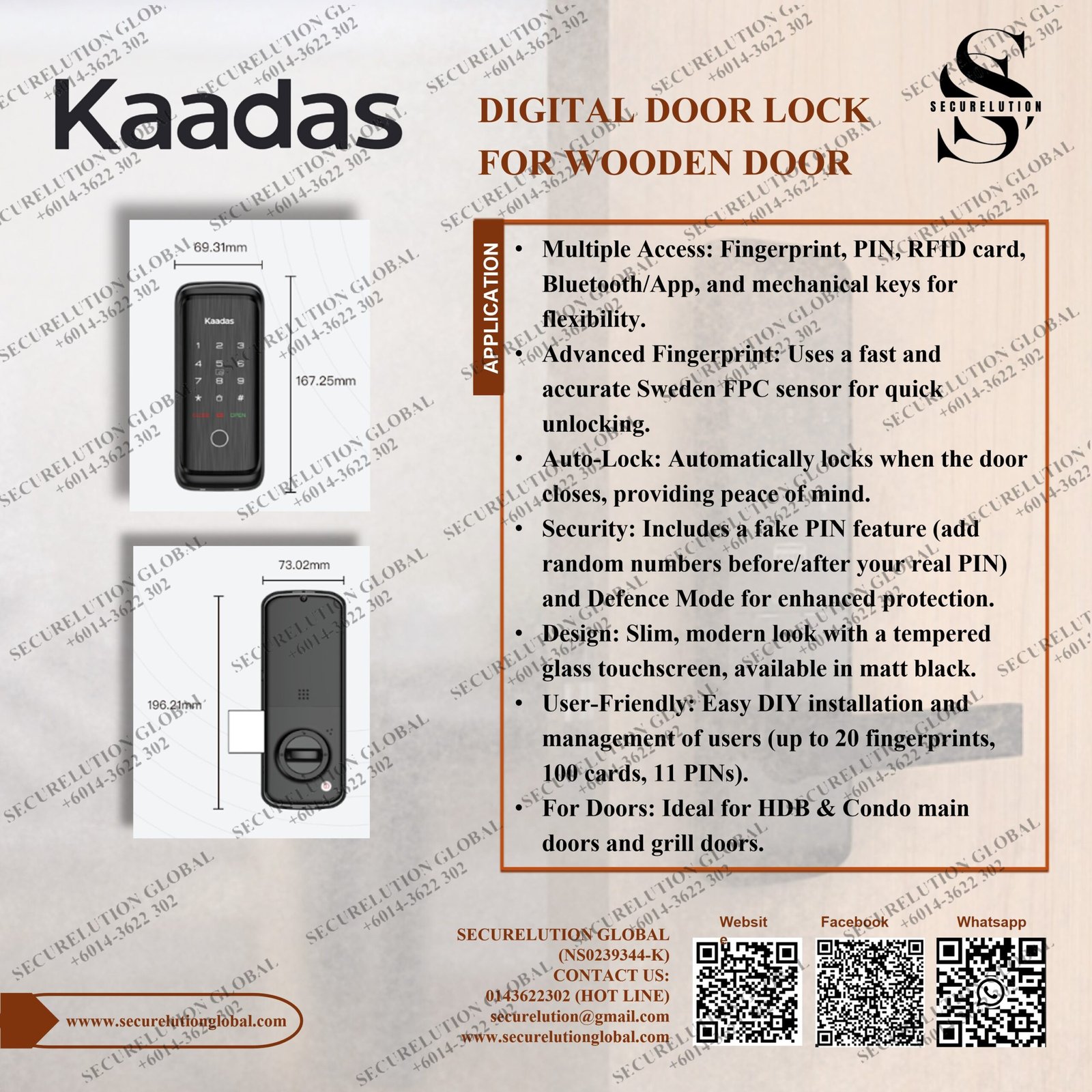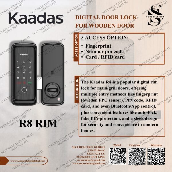The Kaadas R8 is a popular digital rim lock for main/grill doors, offering multiple entry methods like fingerprint (Sweden FPC sensor), PIN code, RFID card, and even Bluetooth/App control, plus convenient features like auto-lock, fake PIN protection, and a sleek design for security and convenience in modern homes.