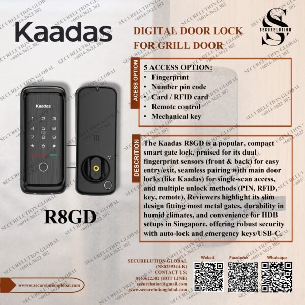 The Kaadas R8GD is a popular, compact smart gate lock, praised for its dual fingerprint sensors (front & back) for easy entry/exit, seamless pairing with main door locks (like Kaadas) for single-scan access, and multiple unlock methods (PIN, RFID, key, remote). Reviewers highlight its slim design fitting most metal gates, durability in humid climates, and convenience for HDB setups in Singapore, offering robust security with auto-lock and emergency keys/USB-C.