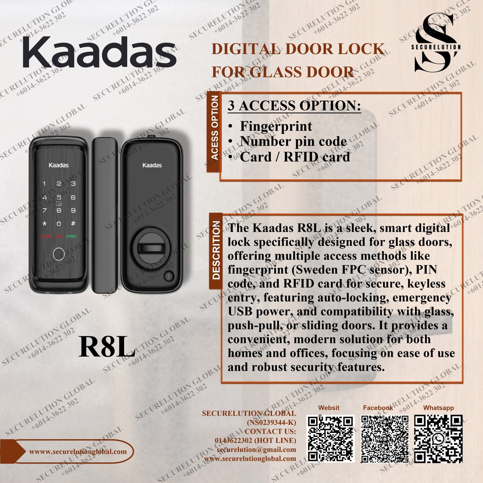 The Kaadas R8L is a sleek, smart digital lock specifically designed for glass doors, offering multiple access methods like fingerprint (Sweden FPC sensor), PIN code, and RFID card for secure, keyless entry, featuring auto-locking, emergency USB power, and compatibility with glass, push-pull, or sliding doors. It provides a convenient, modern solution for both homes and offices, focusing on ease of use and robust security features.