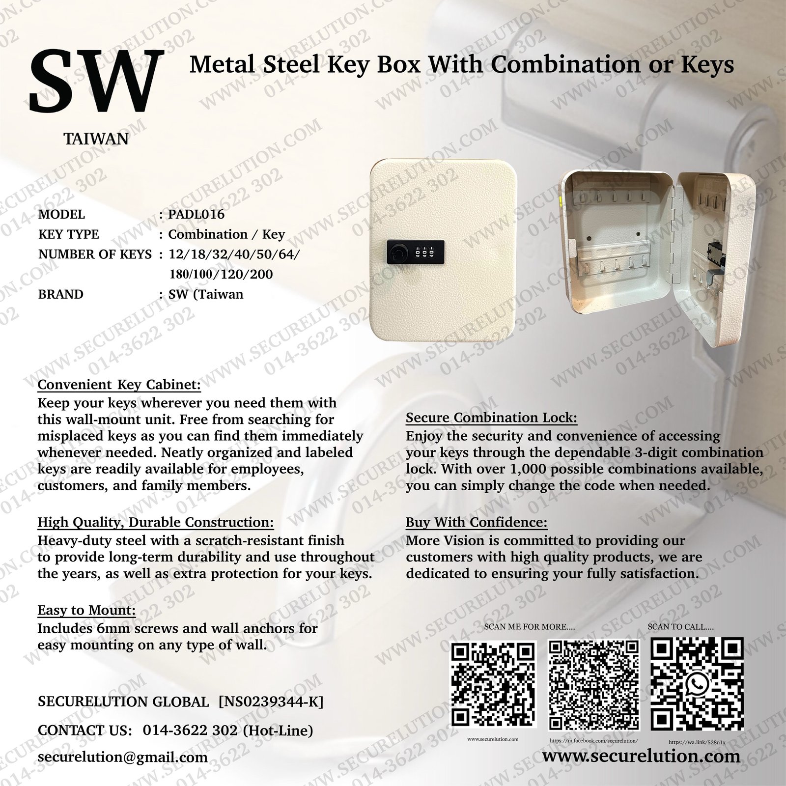 Enjoy the security and convenience of accessing your keys through the dependable 3-digit combination lock. With over 1,000 possible combinations available, you can simply change the code when needed.