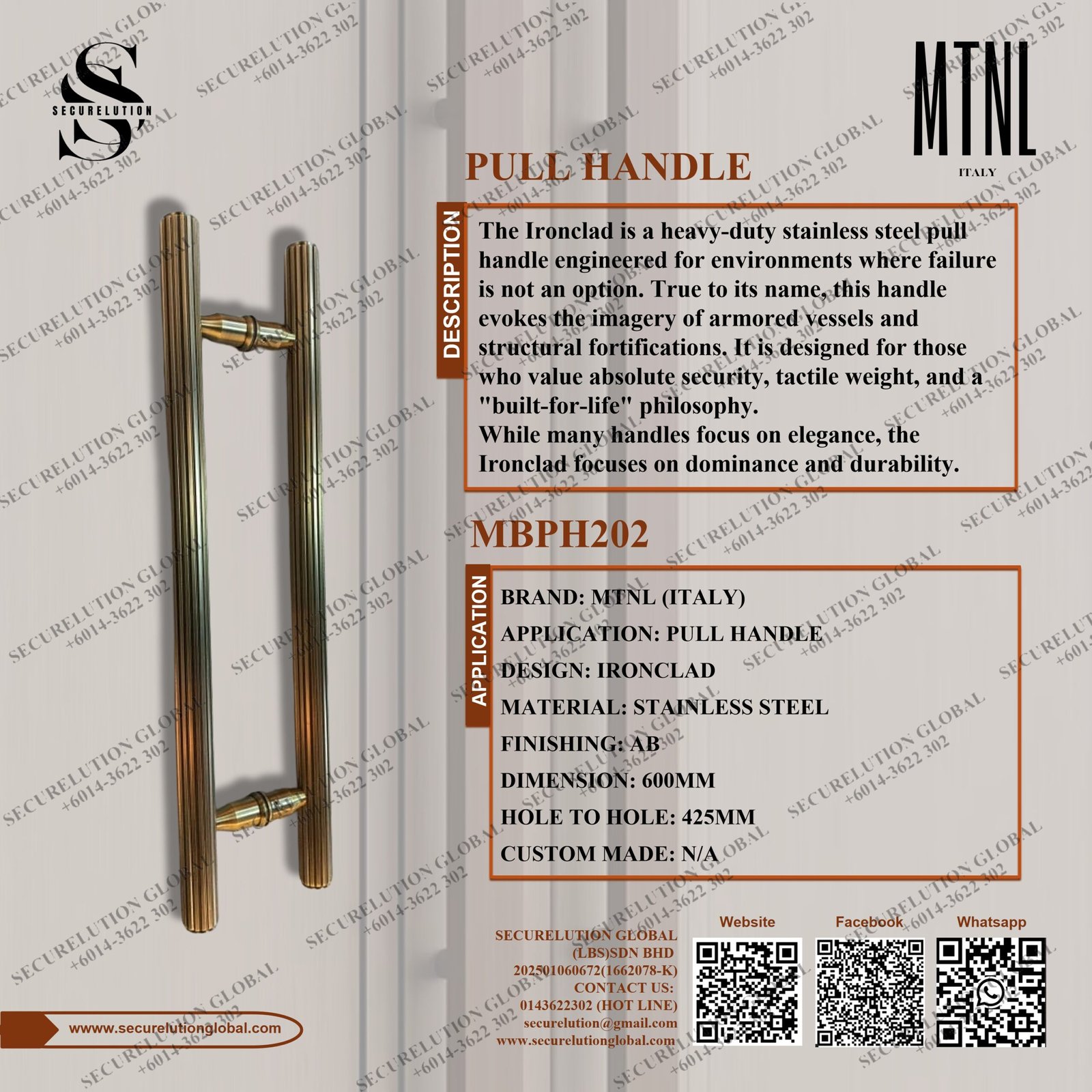 The Ironclad is a heavy-duty stainless steel pull handle engineered for environments where failure is not an option. True to its name, this handle evokes the imagery of armored vessels and structural fortifications. It is designed for those who value absolute security, tactile weight, and a “built-for-life” philosophy.