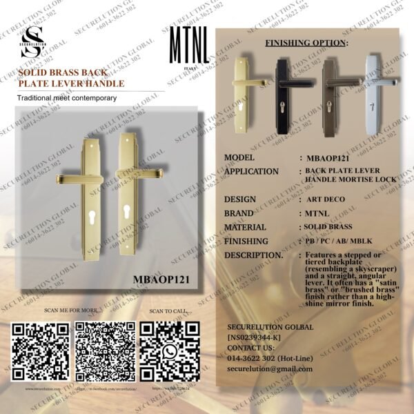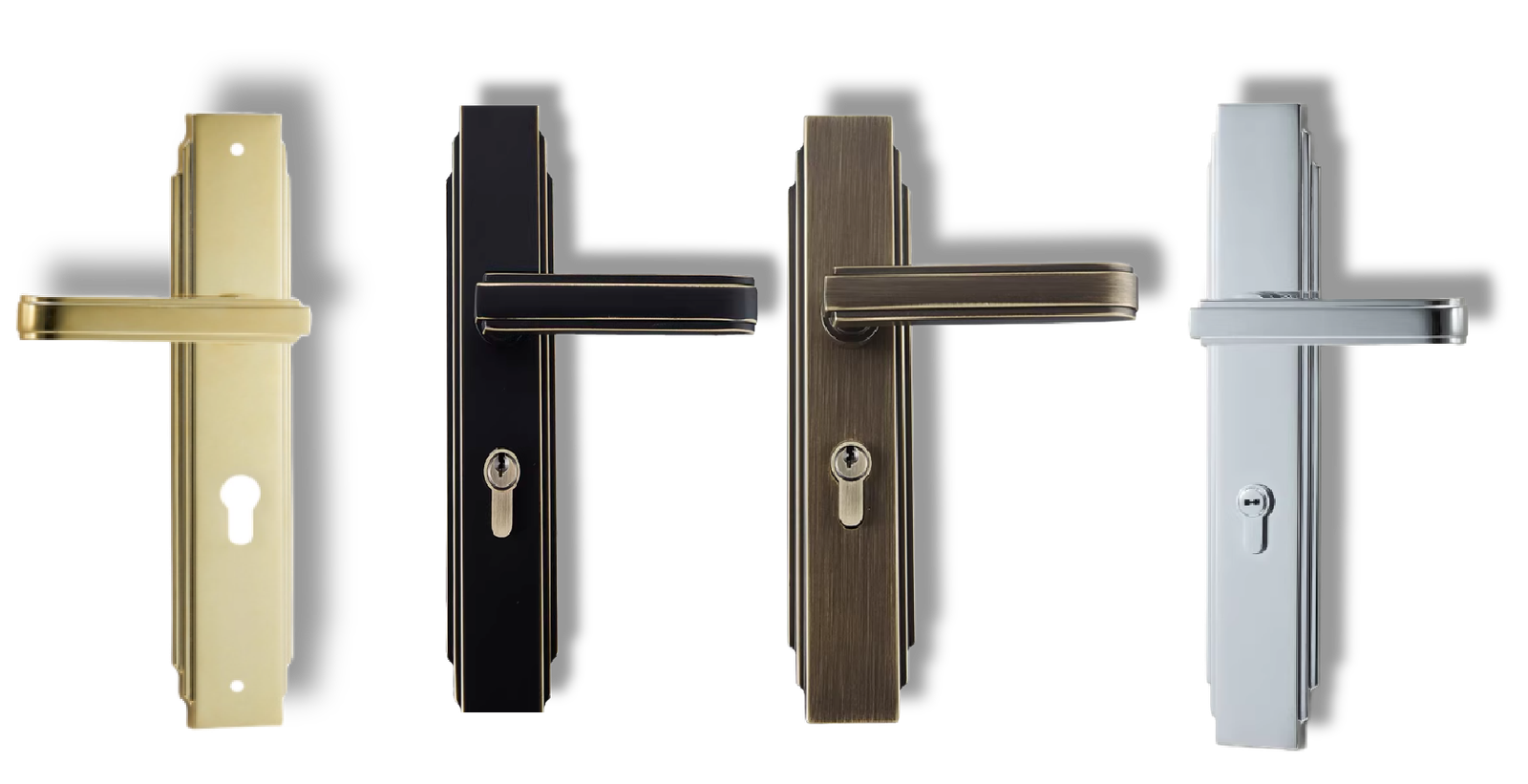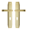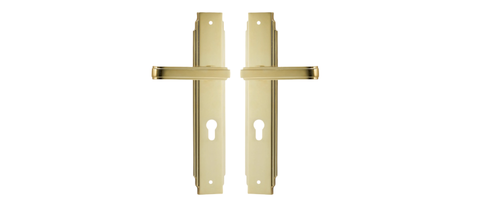 Features a stepped or tiered backplate (resembling a skyscraper) and a straight, angular lever. It often has a “satin brass” or “brushed brass” finish rather than a high-shine mirror finish.