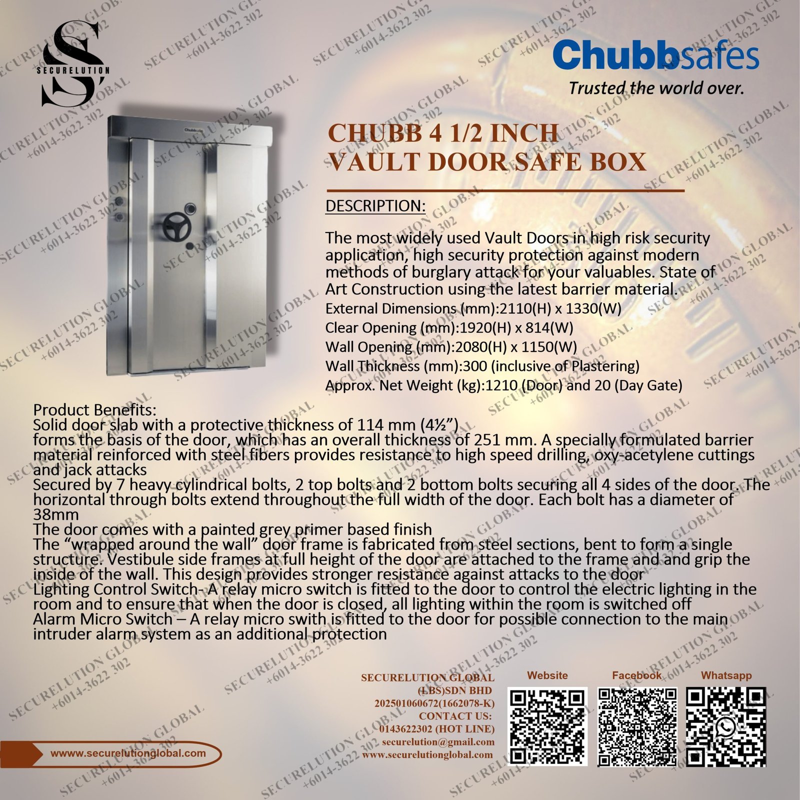 The most widely used Vault Doors in high risk security application, high security protection against modern methods of burglary attack for your valuables. State of Art Construction using the latest barrier material.