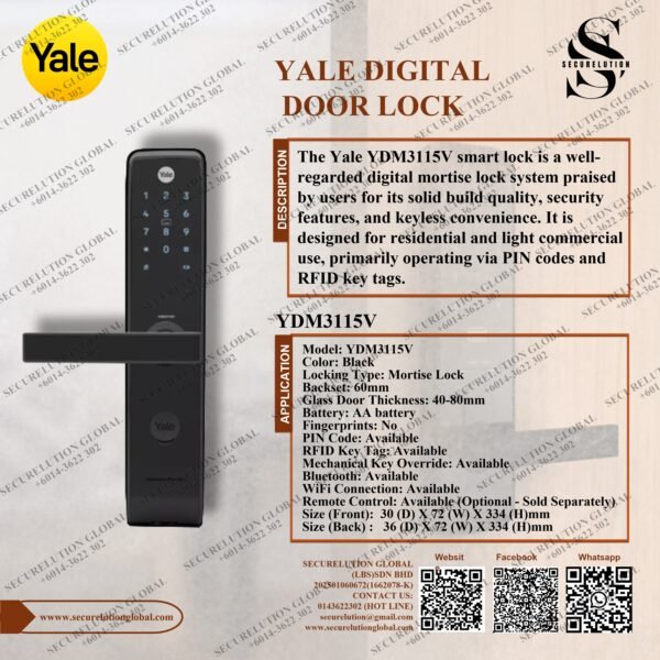 The Yale YDM3115V smart lock is a well-regarded digital mortise lock system praised by users for its solid build quality, security features, and keyless convenience. It is designed for residential and light commercial use, primarily operating via PIN codes and RFID key tags.