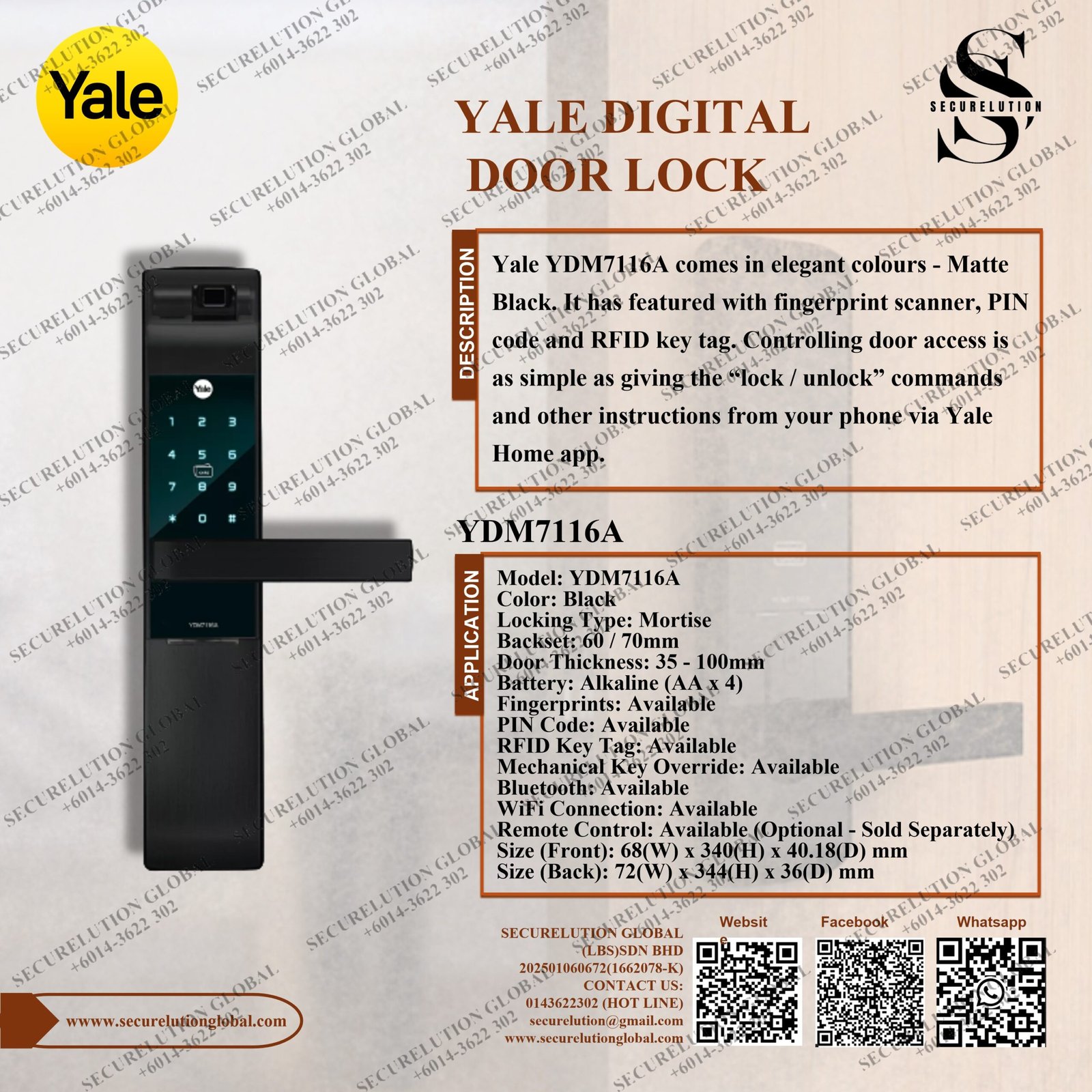 Yale YDM7116A comes in elegant colours – Matte Black. It has featured with fingerprint scanner, PIN code and RFID key tag. Controlling door access is as simple as giving the “lock / unlock” commands and other instructions from your phone via Yale Home app.