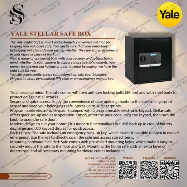 The Yale Stellar Safe is smart and extremely convenient solution for keeping your valuables safe. You can be sure that your important belongings will stay safe and secure, whether they are stored at home or in your office or place of work.